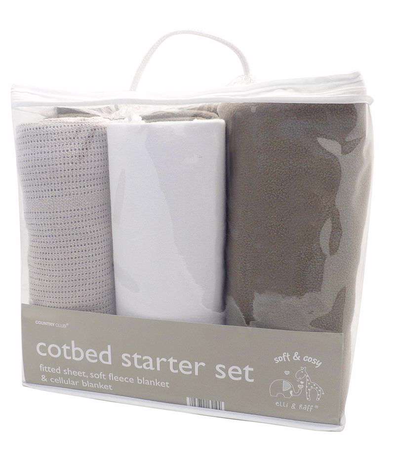 Cellular blanket: (100 x 150cm), Soft fleece blanket (120 x 150cm), Fitted sheet (70 x 140cm)